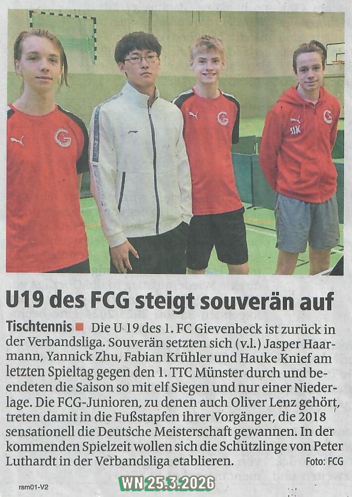 Die Jugend U19 der Tischtennisabteilung des 1. FC Gievenbeck 1949 e.V. hat einen großen Erfolg zu verbuchen: Am Ende der Saison 2025/2026 steht nur eine Niederlage zu Buche, alle anderen Einsätze endeten mit einem Sieg. Der erhoffte Aufstieg gelang damit souverän – und auch die zweite Mannschaft zeigte sich konkurrenzfähig: Sie erspielte, ebenfalls in der Bezirksoberliga, am Ende den vierten Tabellenplatz.